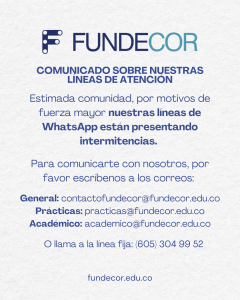 FUNDECOR es una institución de Educación para el Trabajo y el Desarrollo Humano con más de 12 años de trayectoria en la región Caribe colombiana, dedicada a ofrecer formación técnico-laboral de calidad para responder a las necesidades del sector productivo, con énfasis en empleabilidad, innovación, y responsabilidad social. Promovemos el trabajo en equipo, el pensamiento crítico y el uso de herramientas tecnológicas actualizadas para el desempeño laboral eficiente y ético.
